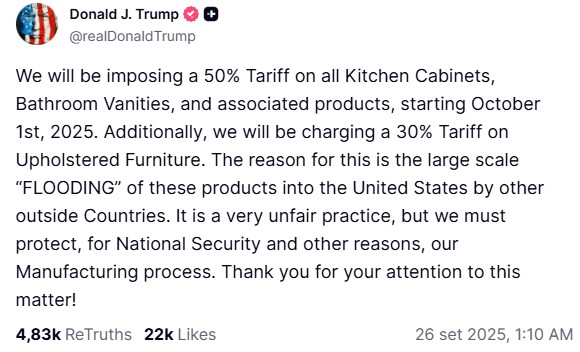 Il presidente degli Stati Uniti, Donald Trump, ha annunciato su Truth l’introduzione di nuovi dazi a partire dal 1° ottobre 2025. «Imporremo un dazio del 50% su mobili da cucina e da bagno, oltre a un dazio del 30% sui divani e le poltrone», ha scritto Trump. La misura, ha spiegato, risponde al «grande afflusso» di questi prodotti negli Stati Uniti da parte di Paesi esteri, definita «una pratica profondamente sleale». «Dobbiamo proteggere il nostro processo produttivo per motivi di sicurezza nazionale e altre ragioni», ha aggiunto il presidente.