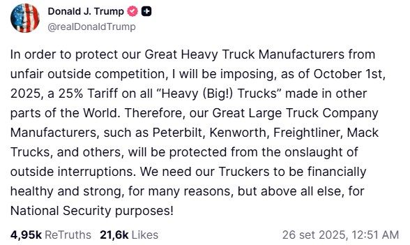 Il presidente degli Stati Uniti, Donald Trump, ha annunciato su Truth che a partire dal dal 1° ottobre 2025 verrà imposto un dazio del 25% su tutti i mezzi pesanti, come i camion, prodotti all’estero. «Vogliamo tutelare aziende americane che producono camion dalla concorrenza sleale estera», ha spiegato Trump, specificando che i trasportatori statunitensi devono essere «tutelati economicamente, e soprattutto è necessario garantire la sicurezza nazionale».