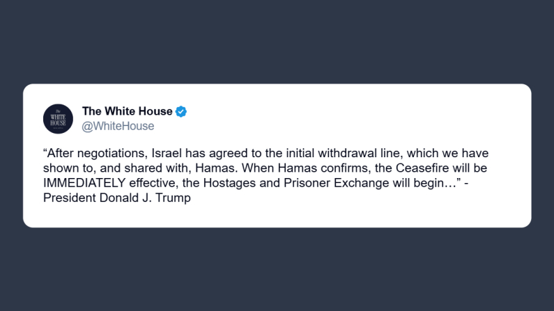 La Casa Bianca ha riportato su X il messaggio del presidente degli Stati Uniti, Trump: «Dopo i negoziati, Israele ha accettato la linea iniziale di ritiro, che abbiamo mostrato e condiviso con Hamas. Quando Hamas confermerà, il cessate il fuoco entrerà in vigore immediatamente, e inizierà lo scambio di ostaggi e prigionieri».