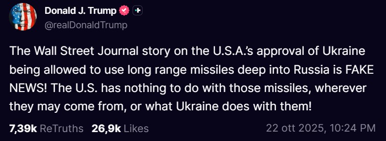 «L’articolo del Wall Street Journal sull’approvazione degli Stati Uniti all’uso da parte dell’Ucraina di missili a lungo raggio in profondità nel territorio russo è una notizia falsa! Gli Stati Uniti non hanno nulla a che fare con quei missili, qualunque sia la loro provenienza, né con l’uso che l’Ucraina ne fa!».
