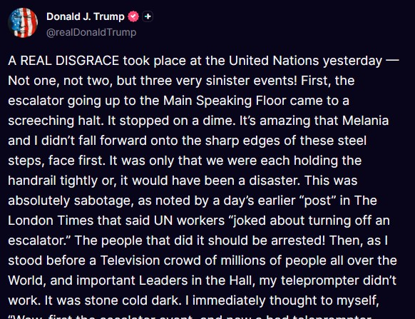 Il presidente degli Stati Uniti, Donald Trump, ha commentato ieri su Truth alcuni episodi accaduti all’Assemblea Generale delle Nazioni Unite, definendoli una «vergogna». Trump ha precisato che la scala mobile che lui e la First Lady hanno utilizzato per arrivare al piano principale si è bloccata all’improvviso: «è incredibile che io e Melania non siamo caduti in avanti. Abbiamo rischiato di sbattere il viso contro i gradini, e se non è successo nulla è solo perché ci siamo tenuti al corrimano». Per il presidente, l’evento sarebbe stato un vero e proprio «sabotaggio», e ha poi citato un articolo del London Times che riporta alcuni operatori dell’Onu scherzare sul «disattivare una scala mobile».
