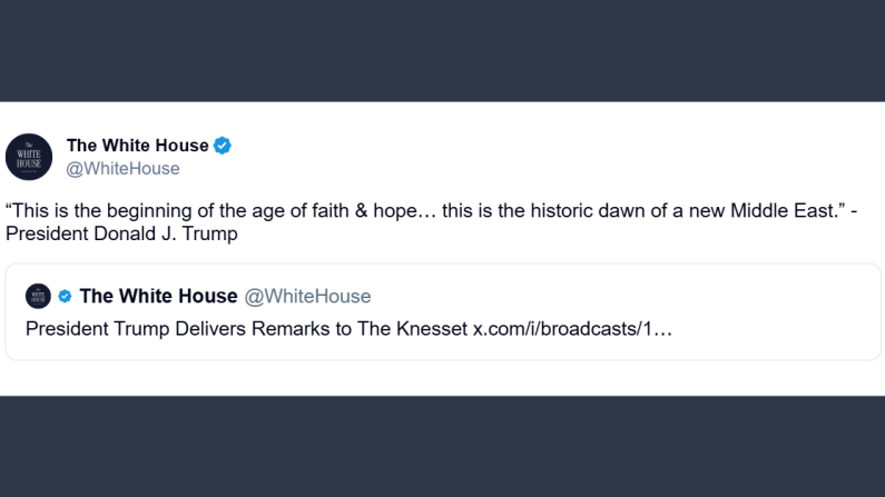 La Casa Bianca ha riportato su X le parole del presidente degli Stati Uniti, Donald Trump, in riferimento ai recenti sviluppi in Medio Oriente e alla liberazione degli ostaggi a Gaza: «Questo è l’inizio dell’era della fede e della speranza. Questo è l’alba storica di un nuovo Medio Oriente».