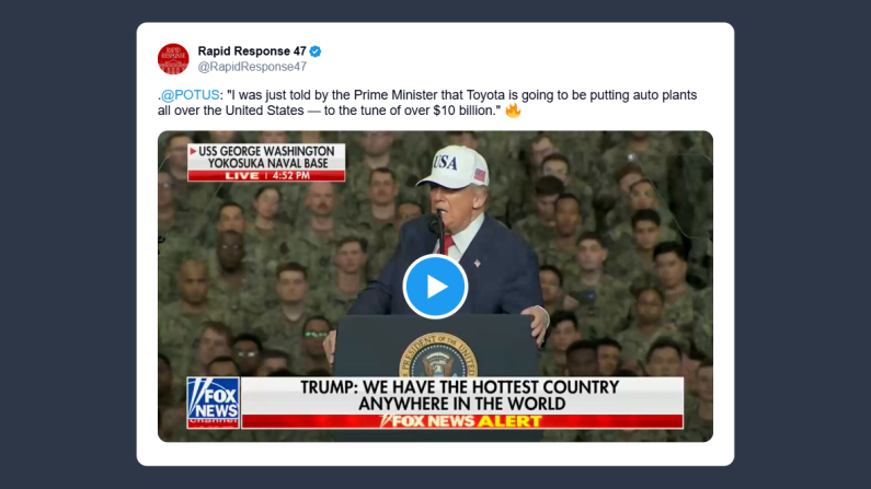 La Casa Bianca ha pubblicato su tramite Rapid Response 47 la seguente dichiarazione del presidente degli Stati Uniti Donald Trump: «il primo ministro mi ha appena comunicato che Toyota costruirà stabilimenti automobilistici in tutti gli Stati Uniti, per un investimento di oltre 10 miliardi di dollari».