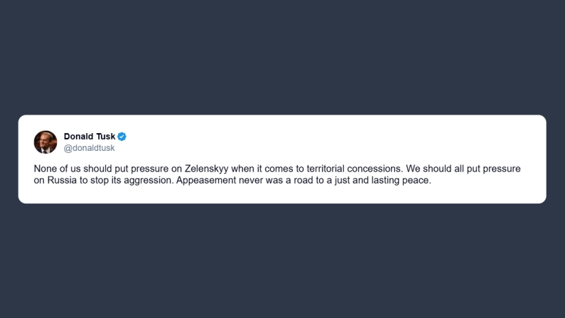 Il primo ministro della Polonia, Donald Tusk, ha scritto ieri su X: «nessuno di noi dovrebbe fare pressioni su Volodymyr Zelensky per concessioni territoriali. Dovremmo invece tutti fare pressione sulla Russia affinché cessi la sua aggressione». Tusk ha poi concluso evidenziando che «conciliare non ha mai portato a una pace giusta e duratura».