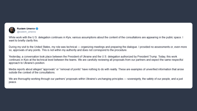 Il segretario del Consiglio nazionale di sicurezza e difesa dell’Ucraina, Rustem Umerov, ha scritto su X: «mentre proseguono a Kiev i colloqui con la delegazione statunitense, nello spazio pubblico stanno circolando varie ipotesi sul contenuto delle consultazioni. Voglio chiarire brevemente la situazione. Durante la mia visita negli Stati Uniti il mio ruolo è stato esclusivamente tecnico, organizzare gli incontri e preparare il dialogo. Non ho fornito valutazioni né, tantomeno, approvazioni su alcun punto. Non rientra nelle mie competenze e non corrisponde alla procedura. Ieri si è svolto il colloquio tra il presidente dell’Ucraina e la delegazione americana autorizzata dal presidente Trump. Oggi il lavoro continua a Kiev a livello tecnico tra i rispettivi team. Stiamo esaminando con attenzione tutte le proposte dei partner e ci aspettiamo lo stesso approccio rispettoso verso la posizione ucraina. Le notizie apparse sui media su presunte “approvazioni” o “cancellazioni di punti” non hanno nulla a che fare con la realtà. Si tratta di informazioni non verificate, nate fuori dal contesto dei colloqui. Stiamo valutando con cura le proposte dei partner nel rispetto dei principi immutabili dell’Ucraina, sovranità, sicurezza del nostro popolo e pace giusta».
