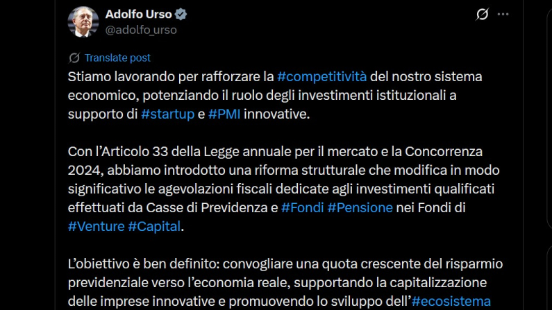 Il ministro delle Imprese e del Made in Italy, Adolfo Urso, ha annunciato su X: «con l’Articolo 33 della Legge annuale per il mercato e la Concorrenza 2024, abbiamo introdotto una riforma strutturale che modifica in modo significativo le agevolazioni fiscali dedicate agli investimenti qualificati effettuati da Casse di Previdenza e Fondi Pensione nei Fondi di Venture Capital». L’obiettivo, spiega Urso, è «convogliare una quota crescente del risparmio previdenziale verso l’economia reale», sostenendo la capitalizzazione delle imprese innovative e lo sviluppo dell’ecosistema italiano del venture capital.