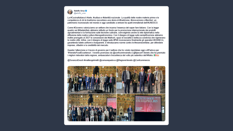Il ministro delle Imprese e del Made in Italy, Adolfo Urso, ha scritto su X: «la cucina Italiana è arte, cultura e identità nazionale. La qualità delle nostre materie prime e le competenze di chi le trasforma raccontano una storia di tradizione, innovazione e territori. Un patrimonio riconosciuto nel mondo e oggi candidato a entrare tra quelli immateriali dell’Unesco. Come Governo valorizziamo un settore che incarna l’essenza del saper fare italiano. Con la legge quadro sul Made in Italy abbiamo istituito un fondo per la promozione internazionale dei prodotti agroalimentari e la formazione sulle tecniche culinarie, coinvolgendo anche la rete diplomatica nella diffusione della nostra cultura enogastronomica. Con il disegno di legge sulla semplificazione abbiamo inoltre prorogato al 2027 le concessioni dei dehors, spazi di socialità e bellezza condivisa che rigenerano le nostre città. Infine, con il disegno di legge sulle Pmi riconosciamo finalmente gli operatori Horeca, garantendo tutele uniformi e trasparenti, e introduciamo norme contro le recensioni false, per difendere imprese, cittadini e la credibilità del mercato. Questa l’attenzione e il lavoro di governo per il settore che ho voluto riportare oggi a Padova per “Veneto food excellence”, l’evento promosso da confcommveneto e fipeconf Veneto che ha premiato i migliori ristoratori della regione, ambasciatori d’eccellenza del volto più autentico dell’Italia».