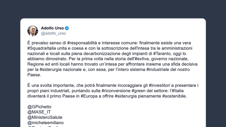 Urso ha definito l’accordo una svolta storica: «per la prima volta nella storia dell’Ex Ilva, governo nazionale, Regione ed enti locali hanno trovato un’intesa per affrontare insieme una sfida decisiva per la siderurgia nazionale e, con essa, per l’intero sistema industriale del nostro Paese». Il ministro ha sottolineato che l’intesa «potrà finalmente incoraggiare gli investitori a presentare i propri piani industriali, puntando sulla riconversione green del settore: l’Italia diventerà il primo Paese in Europa a offrire siderurgia pienamente sostenibile».