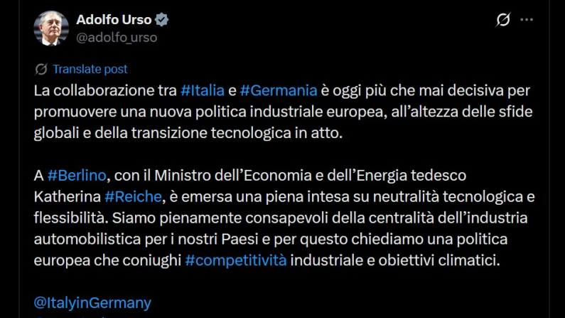 Il ministro delle Imprese e del Made in Italy, Adolfo Urso, ha sottolineato ieri in un post su X l’importanza della collaborazione tra Italia e Germania per una nuova politica industriale europea «all’altezza delle sfide mondiali e della transizione tecnologica in atto». All’incontro di Berlino, con il ministro dell’Economia e dell’Energia tedesco Katherina Reiche, è emersa una «piena intesa su neutralità tecnologica e flessibilità». Urso ha poi dichiarato: «siamo pienamente consapevoli della centralità dell’industria automobilistica per i nostri Paesi e per questo chiediamo una politica europea che coniughi competitività industriale e obiettivi climatici».