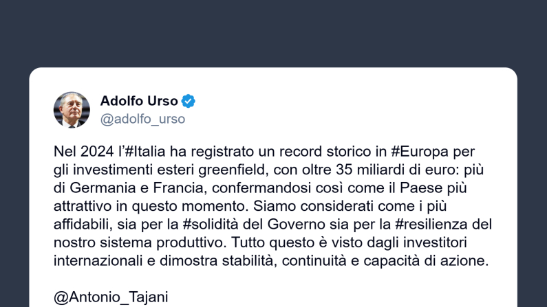 Il ministro delle Imprese e del Made in Italy, Adolfo Urso, ha pubblicato un post su X celebrando i risultati dell’Italia nel 2024 per quanto riguarda gli investimenti esteri greenfield, con «oltre 35 miliardi di euro», superando Germania e Francia. «Siamo il Paese più attrattivo in questo momento», dichiara Urso, con l’Italia considerata come il Paese «più affidabile», sia per la «solidità del Governo sia per la resilienza del nostro sistema produttivo».