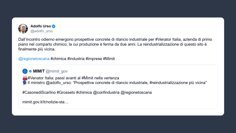 Il ministro delle Imprese e del Made in Italy, Adolfo Urso, ha dichiarato ieri su X: «Dall’incontro odierno emergono prospettive concrete di rilancio industriale per Venator Italia, azienda di primo piano nel comparto chimico, la cui produzione è ferma da due anni. La reindustrializzazione di questo sito è finalmente più vicina».