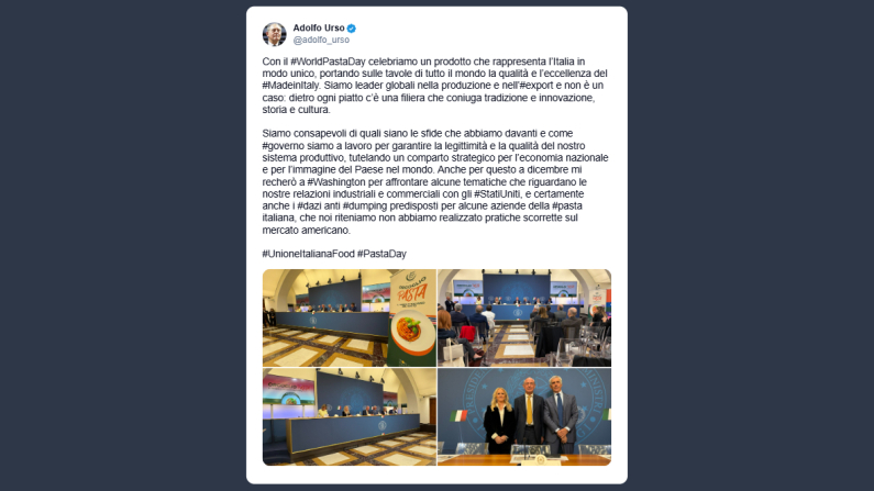 Il ministro delle Imprese e del Made in Italy, Adolfo Urso, ha dichiarato su X: «Con il World Pasta Day celebriamo un prodotto che rappresenta l’Italia in modo unico, portando sulle tavole di tutto il mondo la qualità e l’eccellenza del Made in Italy. Siamo leader mondiali nella produzione e nell’export e non è un caso: dietro ogni piatto c’è una filiera che coniuga tradizione e innovazione, storia e cultura».