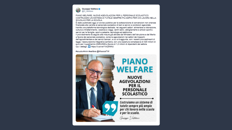 «Il provvedimento fa seguito alle misure già attivate dal Ministero dell’Istruzione e del Merito a favore del personale scolastico, come le agevolazioni nei settori dei trasporti, dell’agroalimentare e dei servizi bancari, a cui si è aggiunta, con i recenti provvedimenti di legge, l’assicurazione integrativa sanitaria, con una copertura complessiva di 320 milioni di euro per il quadriennio 2026-2029 a favore di 1,2 milioni di dipendenti del settore».