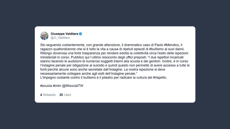 Valditara: seguo da vicino il caso di Paolo Mendico Vittima di bullismo