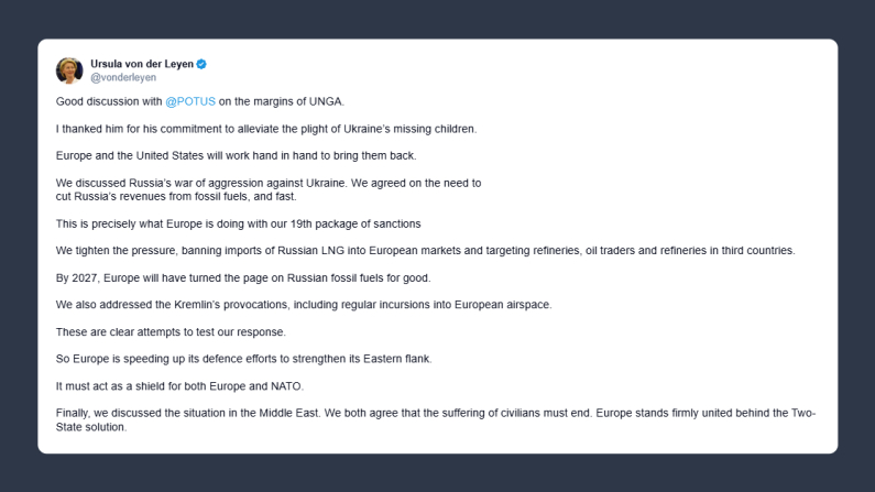 Un colloquio con Donald Trump definito su X «proficuo» dal presidente della Commissione Europea, Ursula von der Leyen, a margine dell’Assemblea generale dell’Onu. «Abbiamo discusso dell’aggressione russa in Ucraina, e abbiamo convenuto sulla necessità di ridurre immediatamente le importazioni russe di combustibili fossili». É esattamente ciò che prevede il diciannovesimo pacchetto di sanzioni, ha spiegato la von der Leyen, sottolineando che entro il 2027, l’Europa avrà «definitivamente voltato pagina sui combustibili fossili russi».