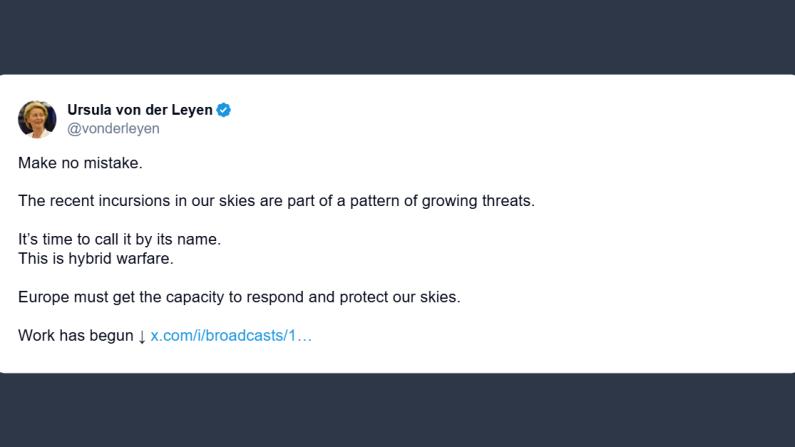 Il presidente della Commissione Europea, Ursula von der Leyen, ha dichiarato su X che le recenti incursioni nei cieli europei fanno parte di una serie di minacce crescenti. «É arrivata l’ora di chiamare le cose con il loro nome: si tratta di una guerra ibrida e l’Ue deve dotarsi delle capacità necessarie per rispondere e proteggere i propri cieli», ha concluso.