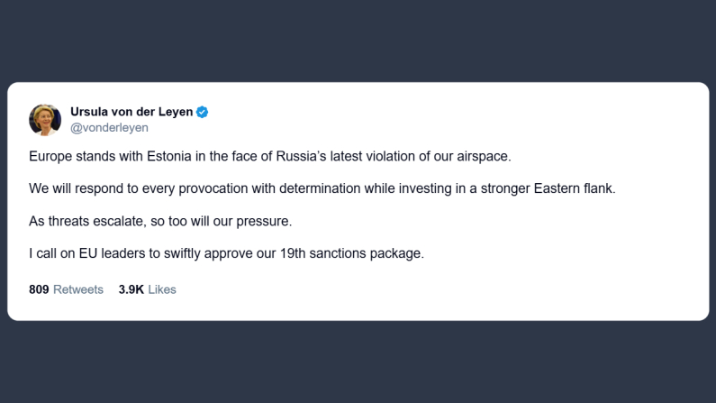 «L’Europa sta al fianco dell’Estonia di fronte all’ultima violazione dello spazio aereo da parte della Russia». Lo ha dichiarato il presidente della Commissione Europea, Ursula von der Leyen, evidenziando che l’Europa risponderà a «ogni provocazione con determinazione e mentre le minacce aumentano, così farà la nostra pressione».