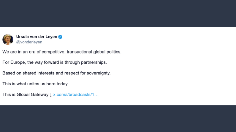 Il presidente della Commissione Europea, Ursula von der Leyen, ha parlato su X del Global Gateway, un progetto dell’Ue lanciato nel 2021 con l’obiettivo di sviluppare nuove infrastrutture nei Paesi in via di sviluppo. «Viviamo in un’era di politica mondiale competitiva e orientata al pragmatismo. Per l’Europa, la strada da seguire è quella delle partnership fondate su interessi condivisi e rispetto per la sovranità. Questo è ciò che ci unisce oggi: questo è il Global Gateway».