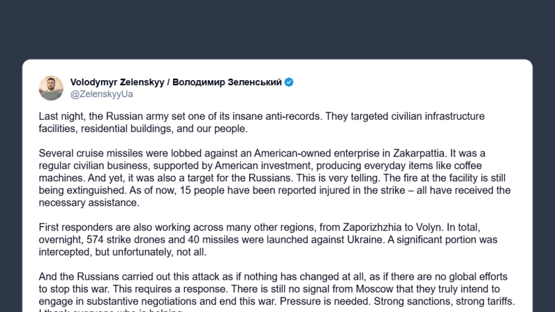 «Ieri notte, l’esercito russo ha segnato un altro dei suoi folli record, ha preso di mira infrastrutture civili ed edifici residenziali ucraini». Lo ha dichiarato il presidente ucraino, Volodymyr Zelensky, in un post su X: Mosca avrebbe lanciato «diversi missili da crociera» contro un’azienda di proprietà americana nella regione di Zakarpattia. L’incendio nell’impianto sarebbe ancora in fase di spegnimento e, al momento, si segnalano 15 feriti.