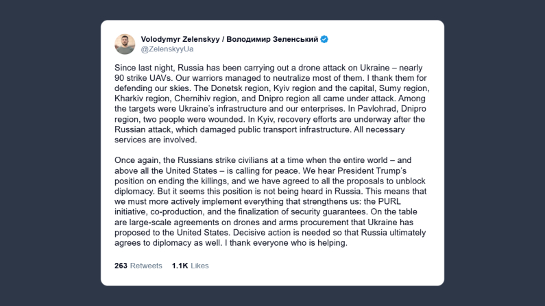 Il presidente ucraino, Volodymyr Zelensky, ha annunciato su X l’attacco russo con i droni di ieri notte, condotto con oltre 90 velivoli d’attacco. «I nostri soldati sono riusciti a neutralizzarne la maggior parte, ma due persone sono rimaste ferite. Le regioni colpite sono quelle di Donetsk, Kiev, Sumy, Kharkiv, Chernihiv e Dnipro». Ancora una volta, dice Zelensky, i russi «colpiscono i civili in un momento in cui il mondo intero, e in particolare gli Stati Uniti, chiede la pace». Il presidente ucraino ha dichiarato di aver accettato tutte le proposte per arrivare alla diplomazia. Ma sembra che «questa posizione venga ignorata da Mosca». Sul tavolo però ci sono accordi per «l’acquisto di droni e armi che l’Ucraina ha proposto agli Stati Uniti. Servono azioni decise affinché anche la Russia accetti infine la diplomazia».