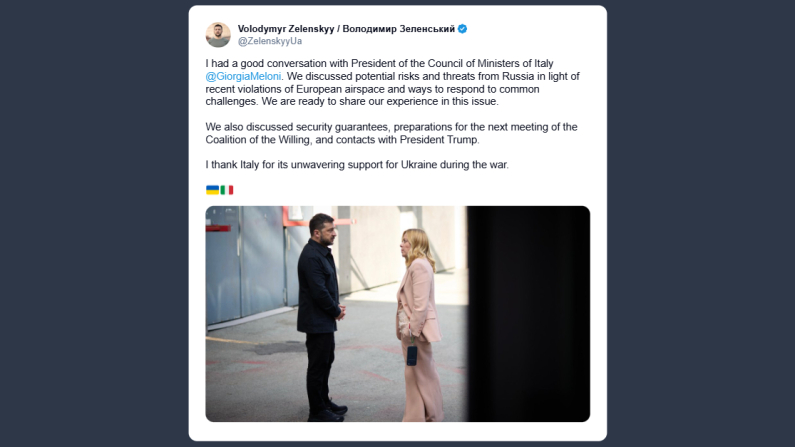 «Ho avuto una proficua conversazione col presidente del Consiglio dei ministri italiano Giorgia Meloni. Abbiamo discusso dei potenziali rischi e minacce provenienti dalla Russia, alla luce delle recenti violazioni dello spazio aereo europeo, e delle strategie per affrontare le sfide comuni. Siamo pronti a condividere la nostra esperienza su questo tema. Abbiamo anche affrontato il tema delle garanzie di sicurezza, i preparativi per il prossimo incontro della Coalizione dei Volenterosi e i contatti con il presidente Donald Trump. Ringrazio l’Italia per il suo costante sostegno all’Ucraina durante il conflitto».