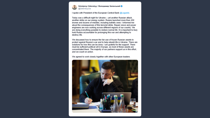Il presidente ucraino Volodymyr Zelensky ha scritto su X che quella di ieri è stata una «notte difficile per l’Ucraina a causa di un altro attacco russo. La Russia ha lanciato oltre 450 droni e decine di missili, balistici inclusi. Ho riferito al presidente della Bce delle conseguenze di questo attacco terroristico». Per il presidente ucraino è fondamentale che la Russia «venga realmente chiamata a rispondere per aver prolungato questa guerra. Abbiamo quindi discusso su come garantire un uso equo dei beni russi congelati per aiutare a ricostruire il nostro Paese». Serve una volontà politica sufficiente in Europa, dice Zelensky, «poiché la maggior parte di questi beni si trova lì. La maggior parte dei nostri partner ci sostiene in questo sforzo, e contiamo su azioni concrete».