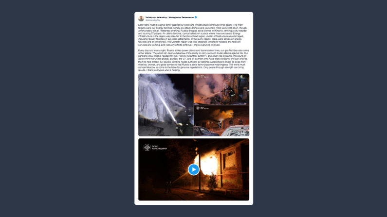 Il presidente ucraino Volodymyr Zelensky ha dichiarato su X: «Ieri notte sono stati lanciati novantasei droni d’attacco, la maggior parte dei quali abbattuti, anche se purtroppo non tutti. Ieri sera, la Russia ha sganciato bombe aeree su Kharkiv, colpendo un ospedale cittadino e ferendo cinquantasette persone, a  Kirovohrad, le infrastrutture civili, incluse quelle ferroviarie di due località, hanno subito danni. Nella regione di Sumy, sono stati colpiti impianti energetici e un’azienda».