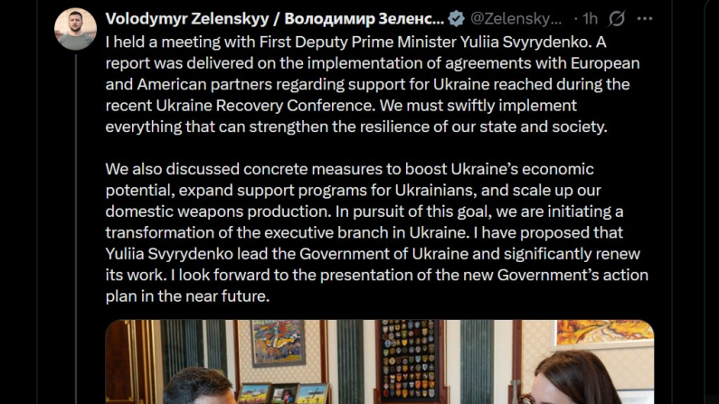 Zelensky ha poi discusso misure per il rilancio economico: «Abbiamo anche discusso misure concrete per potenziare il potenziale economico dell’Ucraina, espandere i programmi di supporto per gli ucraini e incrementare la nostra produzione interna di armi». Ha poi annunciato una riforma governativa: «In quest’ottica, stiamo avviando una trasformazione della branca esecutiva in Ucraina. Ho proposto che Yuliia Svyrydenko guidi il Governo dell’Ucraina e rinnovi significativamente il suo lavoro. Attendo la presentazione del piano d’azione del nuovo Governo nel prossimo futuro».