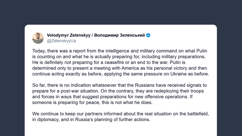 Il presidente ucraino Volodymyr Zelensky ha affermato in un post su X che Putin non starebbe affatto «preparando un cessate il fuoco o la fine della guerra» secondo i dati raccolti dall’intelligence ucraina, ma piuttosto, il presidente russo sarebbe unicamente «determinato» a presentare un incontro con l’America come una sua «vittoria personale», per poi continuare la guerra in Ucraina «esattamente come prima».