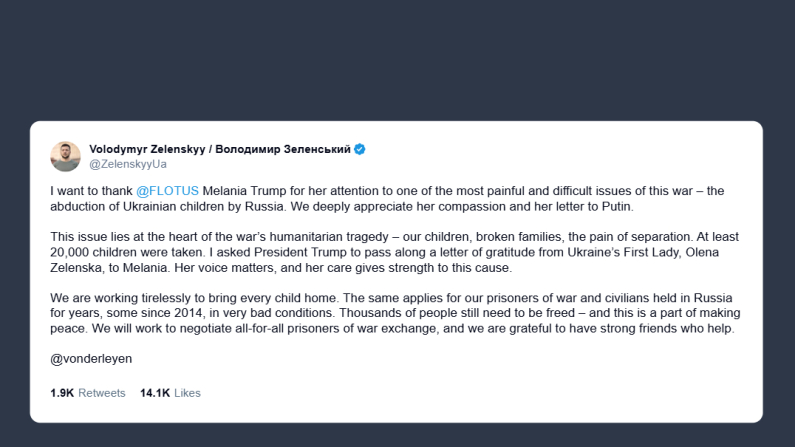Il presidente ucraino, Volodymyr Zelensky, ha scritto un post di gratitudine su X rivolto alla first lady statunitense Melania Trump, che ha scritto una lettera a Vladimir Putin dedicando attenzione a una delle questioni più «dolorose» di questa guerra: il rapimento dei «bambini ucraini» da parte della Russia.
