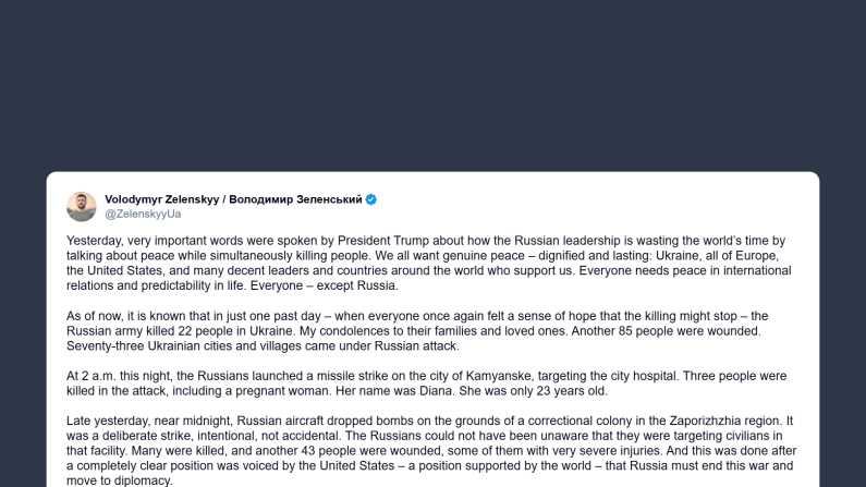 Il presidente ucraino Volodymyr Zelensky ha pubblicato un post su X, commentando le recenti dichiarazioni del presidente Usa Donald Trump su Putin e i suoi continui attacchi in Ucraina. «Tutti vogliamo una pace autentica, dignitosa e duratura: Ucraina, Europa, Stati Uniti e molti altri Paesi nel mondo». Tutti «tranne la Russia», dice il capo del Governo ucraino.