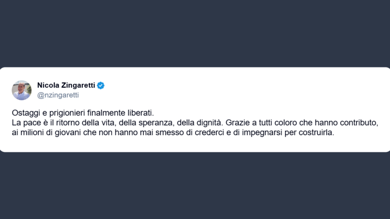 «Ostaggi e prigionieri finalmente liberati. La pace è il ritorno della vita, della speranza, della dignità. Grazie a tutti coloro che hanno contributo, ai milioni di giovani che non hanno mai smesso di crederci e di impegnarsi per costruirla».